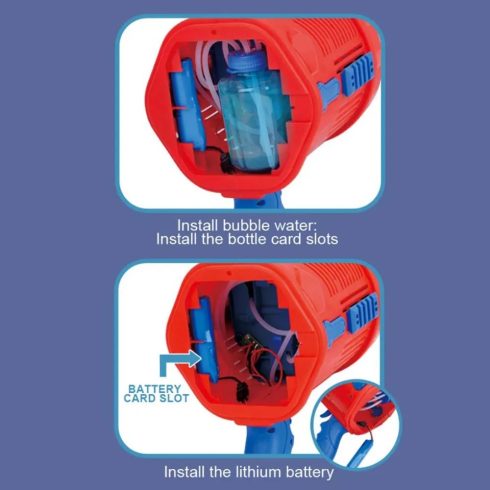 A gomb hosszan tartó lenyomásával színes buborékok jönnek ki ocsövön keresztül.