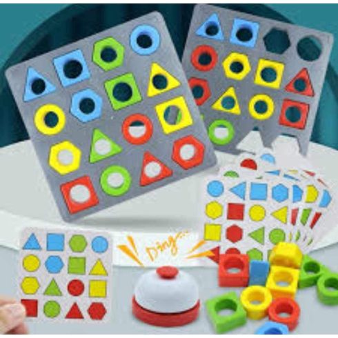 Húzzatok kártyákat és tegyétek ki a szürke táblára a látható alakzatokat a megfelelő sorrendben és színben. Az nyer, aki először csenget!